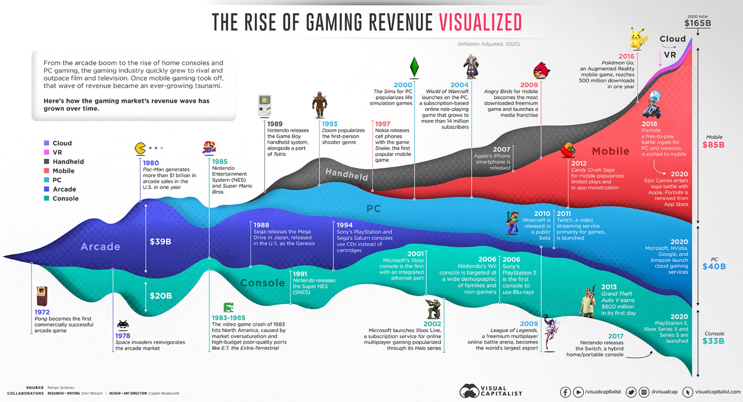 Así han evolucionado los ingresos por plataforma de videojuegos con el paso de los años, según Visual Capitalist. Destaca, como no puede ser de otra manera, el crecimiento de los móviles, hasta los 85.000 millones de dólares en 2020.